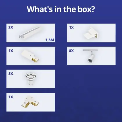 | Fabrikantnaam | Complete L shaped 1-Phase Track Set White incl. 8x Spot fixture + GU10 2700K 3W Dim – 1.5 x 1.5 mete | |
