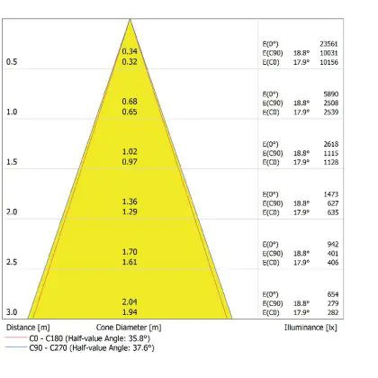 De gradenbundel geeft informatie over hoe breed het licht wordt uitgestraald. Dit zit tussen de 0 en 360 graden (D). Hoe kleiner de hoek, hoe specifieker de lichtbundel is. Over het algemeen is een smalle gradenbundel perfect voor sfeer- of accentverlichting, terwijl een brede gradenbundel ideaal is om grote oppervlaktes te verlichten.