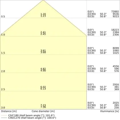 De gradenbundel geeft informatie over hoe breed het licht wordt uitgestraald. Dit zit tussen de 0 en 360 graden (D). Hoe kleiner de hoek, hoe specifieker de lichtbundel is. Over het algemeen is een smalle gradenbundel perfect voor sfeer- of accentverlichting, terwijl een brede gradenbundel ideaal is om grote oppervlaktes te verlichten.