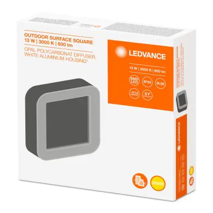 Beschrijving Ledvance Wandlamp LED Surface Vierkant Buitenverlichting 13W 480lm - 830 Warm Wit | 200x200mm - IP54