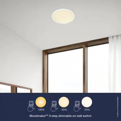 Dat je flexibel kunt zijn met licht, laat deze Oja plafondlamp van Nordlux duidelijk zien. De lamp is voorzien van een 3-staps Moodmaker functie, die je met behulp van je lichtschakelaar kunt instellen. In dit geval heb je 3 dimstanden, die een 2700K licht uitstralen: