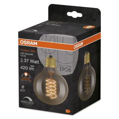 Beschrijving Osram Vintage 1906 LED E27 Globe Filament Gold 80mm 4.8W 420lm - 822 Extra Warm White | Dimmable